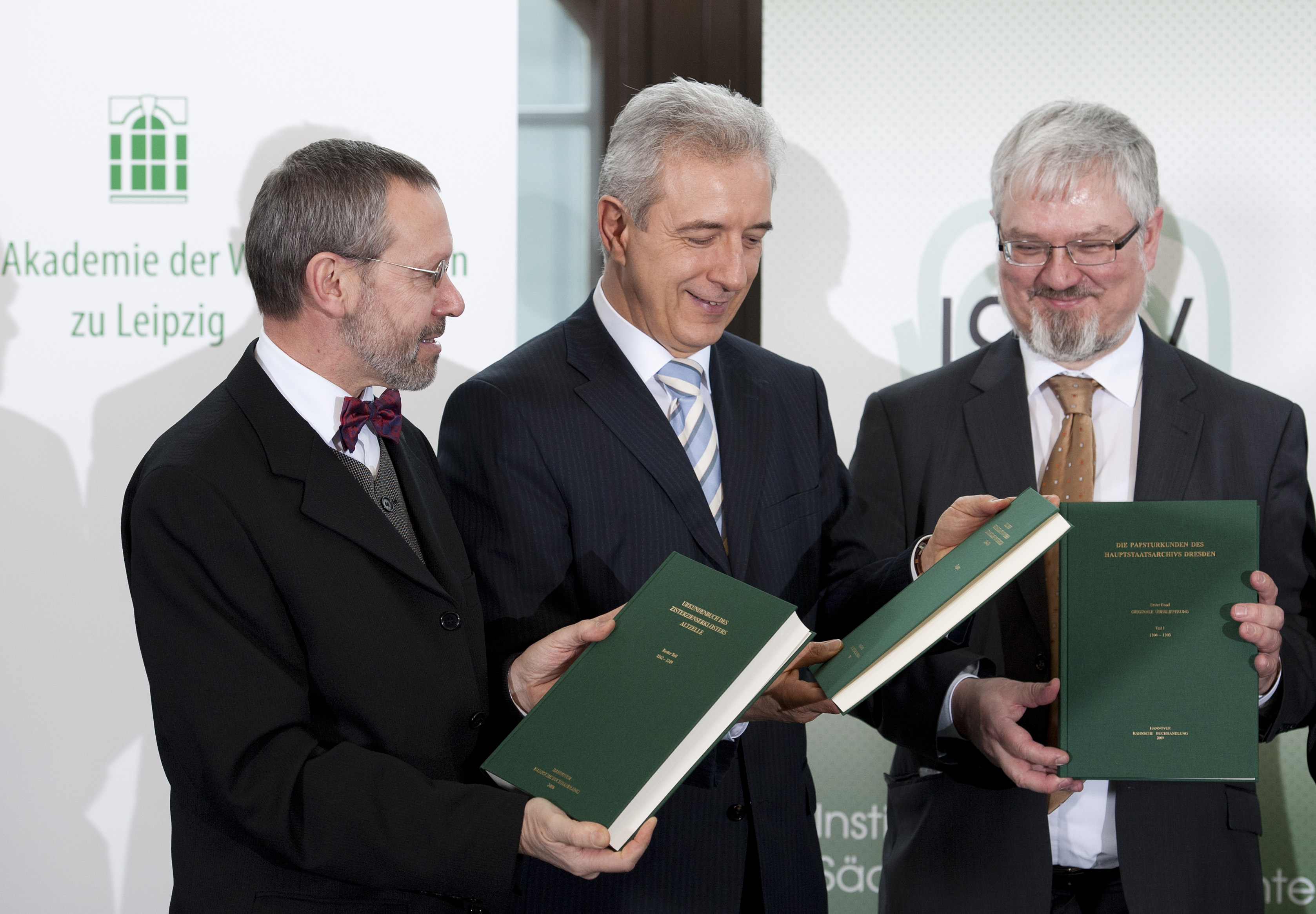 von links: Pirmin Stekeler-Weithofer, Präsident der Sächsischen Akademie der Wissenschaften zu Leipzig; Stanislaw Tillich, Ministerpräsident des Freistaates Sachsen; Enno Bünz, Direktor des Instituts für Sächsische Geschichte und Volkskunde e. V.; Foto: Robert Michael