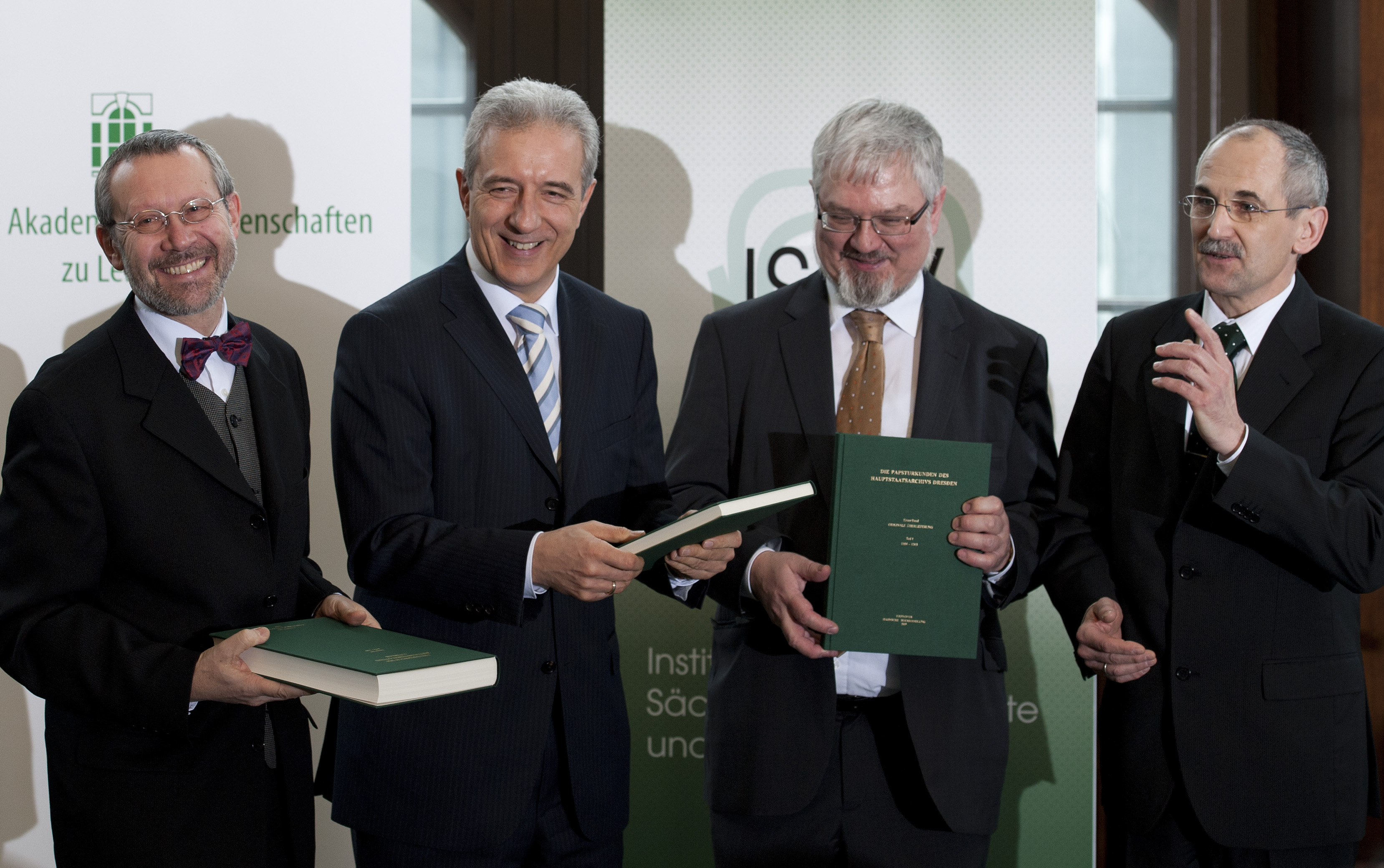 von links: Pirmin Stekeler-Weithofer, Präsident der Sächsischen Akademie der Wissenschaften zu Leipzig; Stanislaw Tillich, Ministerpräsident des Freistaates Sachsen; Enno Bünz, Direktor des Instituts für Sächsische Geschichte und Volkskunde e. V.; Oliver Waffender, Verlag Hahnsche Buchhandlung; Foto: Robert Michael