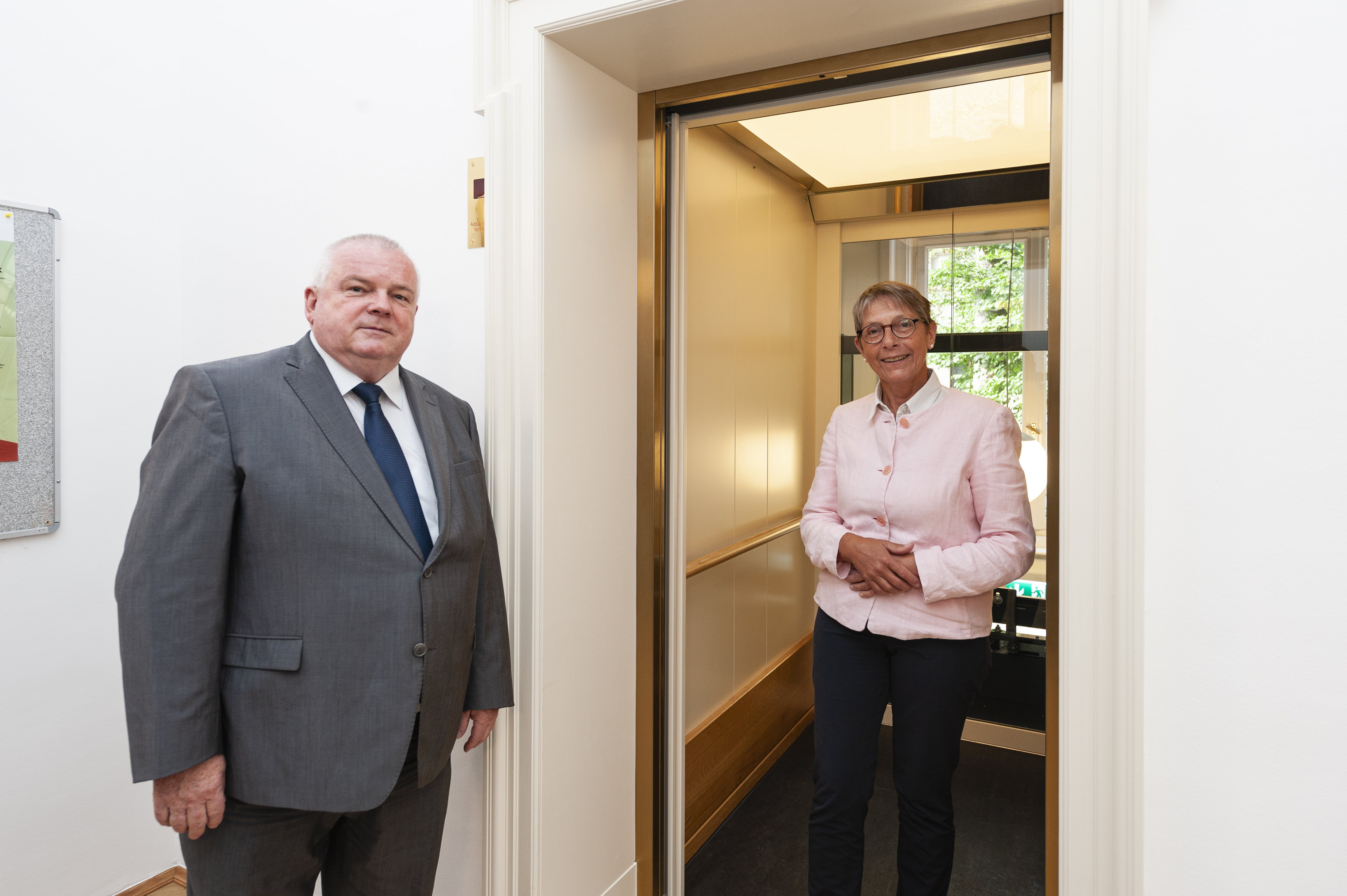 Staatssekretärin Andrea Franke, Sächsisches Staatsministerium für Wissenschaft, Kultur und Tourismus, und Volker Kylau, technischer Geschäftsführer des Staatsbetriebs Sächsisches Immobilien- und Baumanagement (SIB) begutachten den neuen Fahrstuhl. Der SIB war für die Koordinierung der nun abgeschlossenen Baumaßnahme mit rund 20 beteiligten Firmen aus dem Raum Sachsen und Sachsen-Anhalt sowie das Vergabeverfahren verantwortlich. Foto: Marcus Karsten