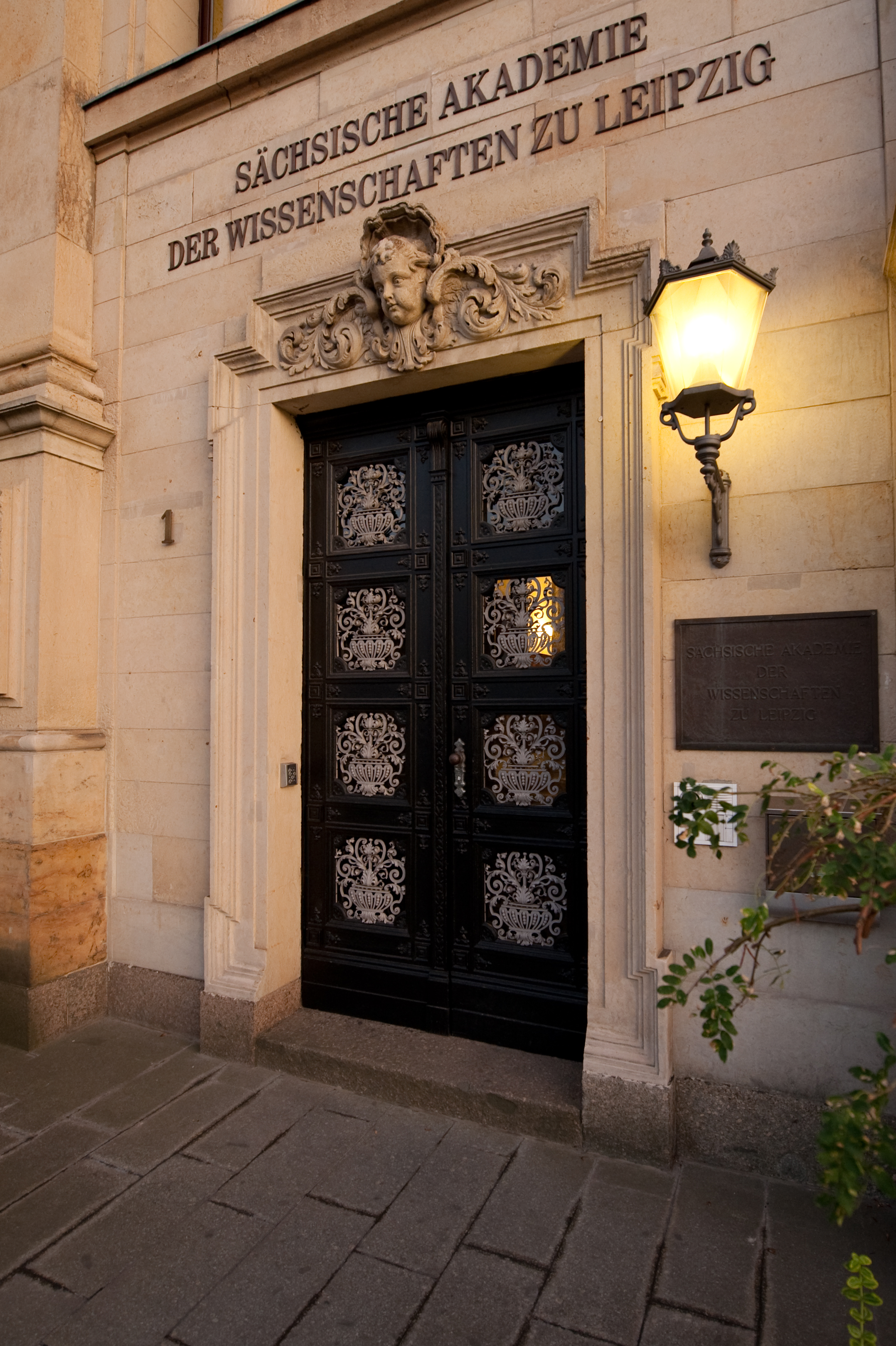 Eingangsportal einer historischen Villa, über dem Eingang steht "Sächsische Akademie der Wissenschaften zu Leipzig", rechts von der Tür leuchtet eine alte Lampe