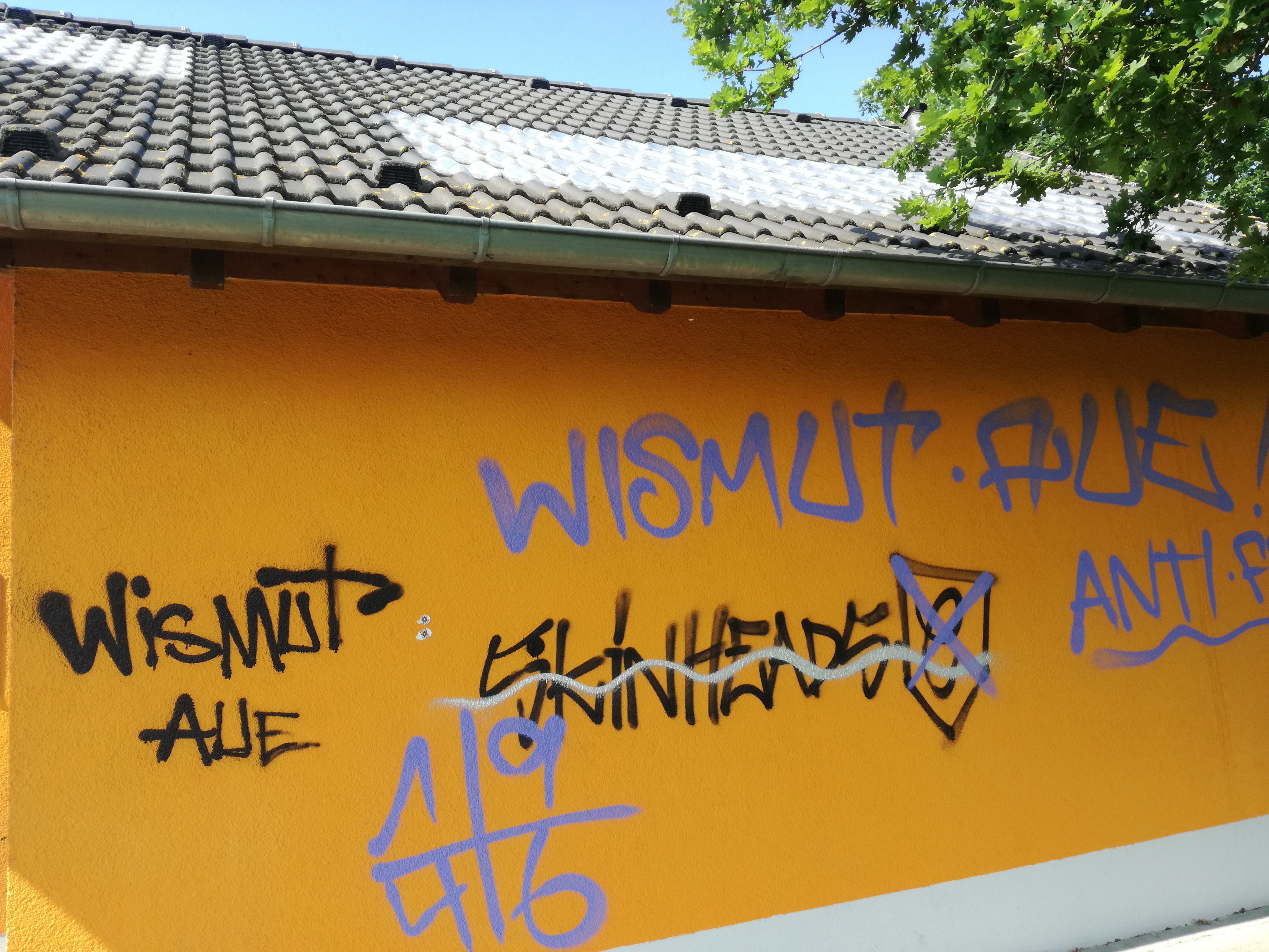 Die Erinnerung an die Wismut wird im öffentlichen Raum durch verschiedene Kommunikationsweisen tradiert, wie das Graffiti zum Fußballklub „Wismut Aue“ an einer Tankstellen Toilettenwand in Sachsen deutlich macht. Foto: Astrid Mignon Kirchhof