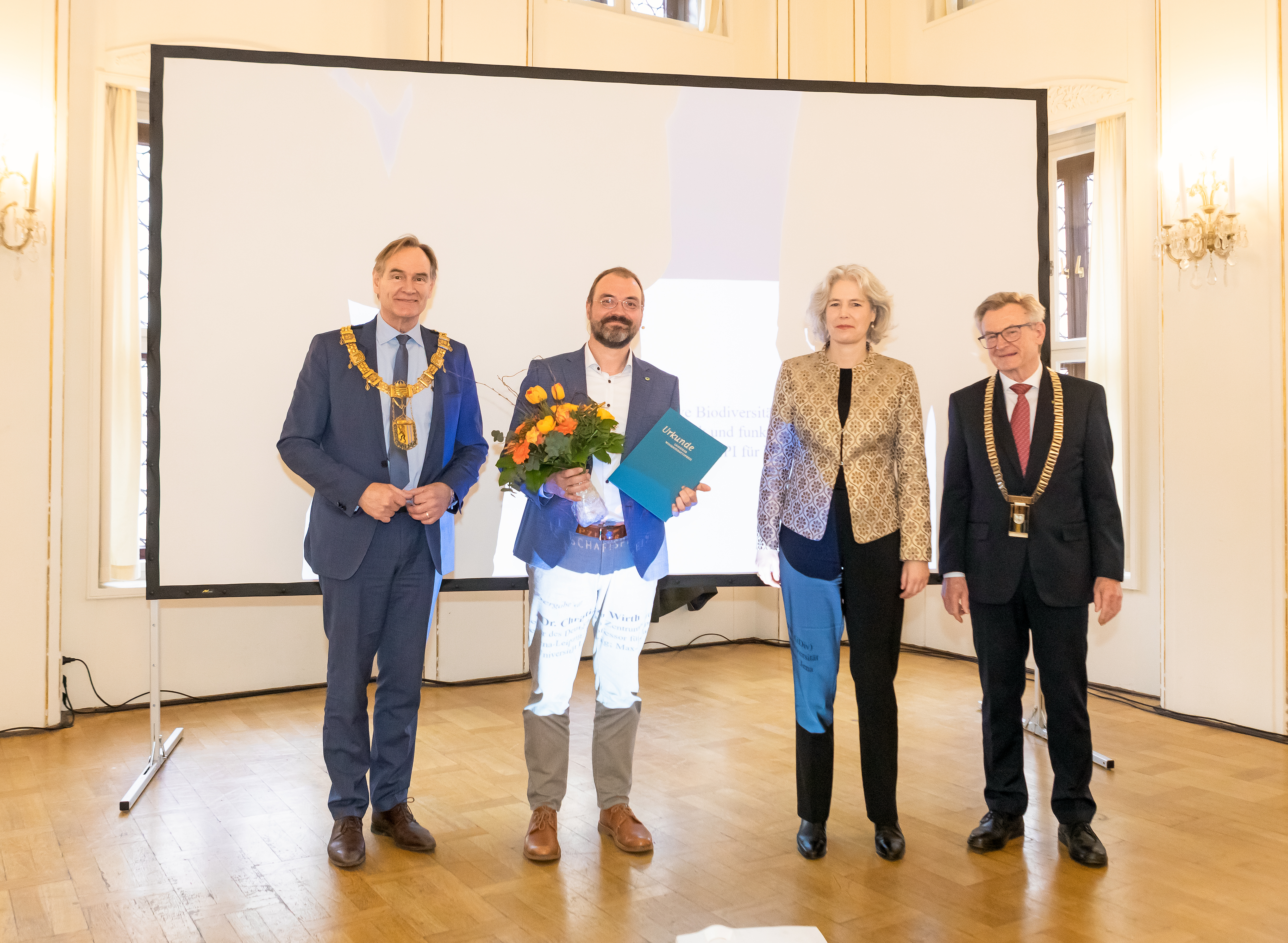Verleihung Leipziger Wissenschaftspreis 2022; v.l.: Burkhard Jung, Oberbürgermeister der Stadt Leipzig; Prof. Dr. Christian Wirth , Preisträger; Prof. Dr. Eva Inés Obergfell, Rektorin der Universität Leipzig; Prof. Dr. Hans Wiesmeth, Präsident der Sächsischen Akademie der Wissenschaften zu Leipzig; Foto: Swen Reichhold, Bild: SAW
