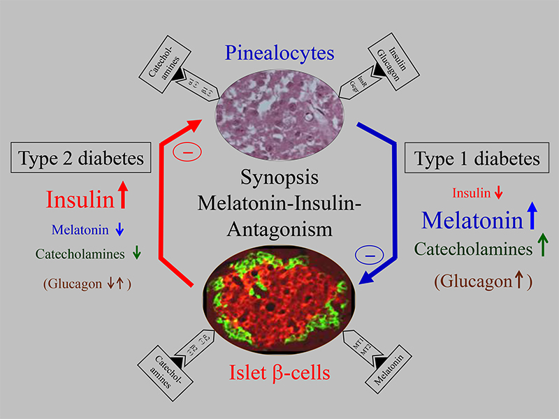 Von Bedeutung waren zusätzlich Untersuchungen an Typ1-diabetischen Ratten, die bei stark erniedrigtem oder fehlendem Insulin erhöhte Melatonin-Plasmaspiegel aufwiesen, also in Umkehrung wiederum einen Insulin-Melatonin-Antagonismus zeigten [Peschke et al. 2008, 2011, 2012, Abb. 1]. In überzeugender Weise konnte weiterhin gezeigt werden, dass nach Insulinsubstitution sich nicht nur die Insulin-, sondern ebenfalls die Melatonin-Spiegel normalisierten. Diese und weitere Befunde haben in Einheit mit umfangreichen Katecholamin-Bestimmungen zu der Überzeugung geführt, dass die Katecholamine für das beschriebene antagonistische Verhalten von Insulin und Melatonin verantwortlich zu machen sind [Übersicht siehe Peschke et al., 2012]. Zusammenfassend kann festgestellt werden, dass Typ 2-Diabetiker erniedrigte Katecholamin- und Melatonin-Spiegel, Typ 1-Diabetiker hingegen erhöhte Katecholamin- und Melatonin-Spiegel aufweisen. Als Erklärung wird angenommen, dass die Katecholamin-Spiegel den Schlüssel für das Verständnis der Gegensinnigkeit darstellen, weil die Melatoninsynthese durch Katecholamine entscheidend gesteigert wird (Abb. 1).